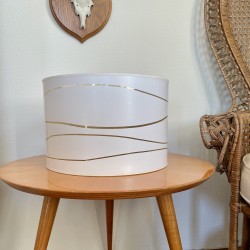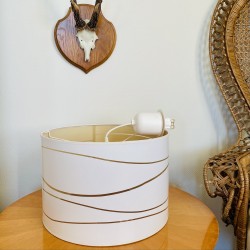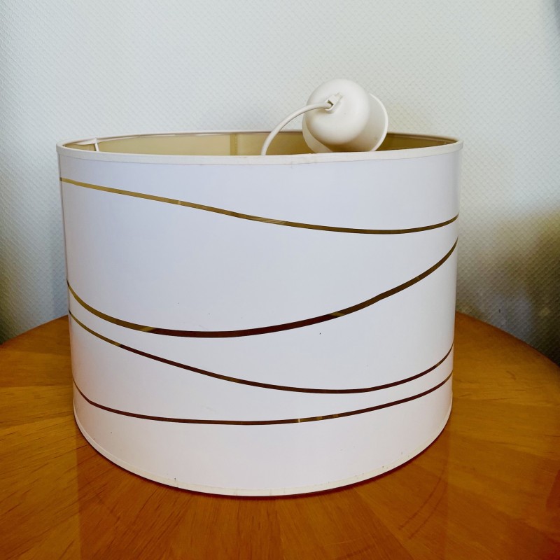 Suspension abat-jour cylindrique vintage typique des années 1980 de couleur blanche aux jolis imprimés linéaires dorés. Cette suspension sera parfaite pour habiller le plafond d'une grande pièce grâce à son diamètre de 35 cm et mettra une belle note de gaieté dans votre intérieur. Le fil électrique permet une hauteur de 47 cm de réglage. Dimensions : (cm) Hauteur 24 x Largeur 35 (diamètre).