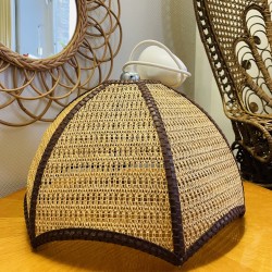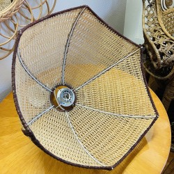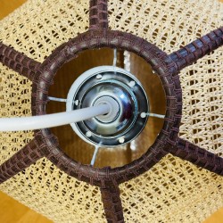 Superbe et grande suspension bicolore en rotin et raphia des années 1970. En très bon état de conservation, elle donnera une touche vintage à votre décoration et se mariera parfaitement avec les couleurs et matières naturelles pour un intérieur ultra tendance. Du plus bel effet une fois installée. Elle est électrifiée et fonctionne parfaitement. Électricité neuve. Pièce unique. Origine France. Dimensions (cm) : Hauteur abat-jour seul avec le fil kit électrique 89 cm ajustable et abat-jour seul 30 x Largeur 40 (diamètre). Le prix comprend le fil kit électrique et douille acier neufs fournis avec la suspension abat-jour. Ampoule à douille vis non fournie.