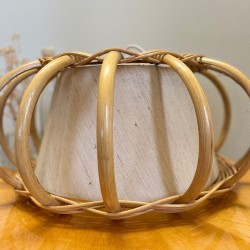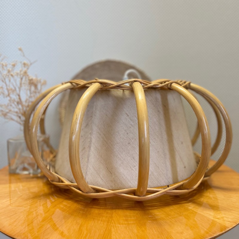 Superbe et très grande suspension bicolore en rotin et en tissus couleur beige authentique des années 1950 1960 du designer Louis Sognot. En excellent état de conservation, elle donnera une touche vintage à votre décoration et se mariera parfaitement avec les couleurs et matières naturelles pour un intérieur bohème éclectique chic ou contemporaine. Du plus bel effet une fois installée, elle laissera passer une lumière. chaude et apaisante. Elle est électrifiée aux nouvelles normes et fonctionne parfaitement. Pièce unique. Origine France. Dimensions (cm) : Hauteur avec tige 65 (soit 26 cm sans tige) x Diamètre 52 . Ampoule à vis.
