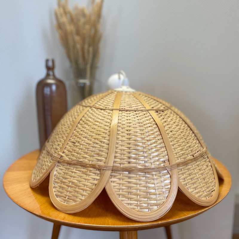Superbe suspension en cannage et rotin des années 1960 1970. En très bon état de conservation, elle est très travaillée, à deux niveaux, cannage sur la partie centrale et tressée sur le haut en forme de pétale de fleurs, ce qui fait toute sa beauté et sa rareté. Cette suspension donnera à l'évidence une touche vintage et élégante à votre décoration. Elle se mariera parfaitement avec les couleurs et matières naturelles pour un intérieur bohème éclectique chic. Du plus bel effet une fois installée, elle laissera passer la lumière et apportera un côté à la fois apaisant et chaud. Elle est électrifiée aux normes et fonctionne parfaitement. Origine France. Dimensions (cm) : Hauteur 28 sans tige abat-jour seul et 53 cm avec le fil et douille électrique (que vous pouvez changer) x Largeur 40. Ampoule douille à vis non fournie.