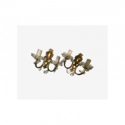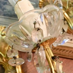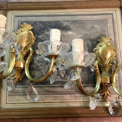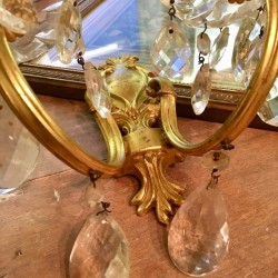 Une sublime paire d'appliques murales anciennes en bronze doré qui se glissera très bien dans un décor chic et raffiné. La préciosité et la finesse des ornementations sont typiques du style louis XVI. Agrémentée de deux belles bobèches en cristal à pampilles, cette paire d'appliques dorée est décorée de jolies pampilles en cristal et vous offrira une ambiance digne des grands châteaux à la Française. En très bon état. Electricité conforme. Dimensions (cm) : Hauteur 20 x Largeur 24 x Profondeur 18.