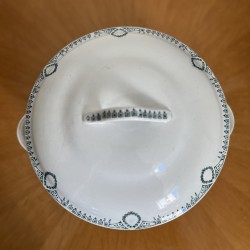 Soupière terre de fer de la manufacture française signée et estampillée Saint-Amand époque début XXème (années 1930). En très bon état de conservation sans aucun manque ni fêlure, quelques légères traces du temps à l'intérieur. Parfait sur une table pour vos potages, plats en sauce, toute préparation culinaire ou en saladier pour sa simplicité intemporelle. Idéale en décoration sur un meuble. Ce service de faïence blanche est orné d'un motif à frise et à décor de noeuds de style Louis XVI couleur verte. Dimensions (cm) : Largeur 31 x Profondeur 26 x Hauteur 22 cm.