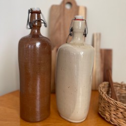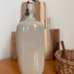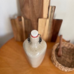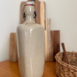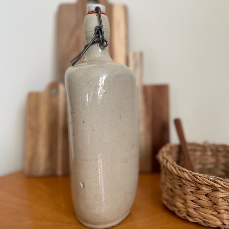 Laissez vous séduire par cette grande et belle bouteille en grès émaillé anciennement appelée cruchon forme triangulaire, avec sa belle patine et sa teinte typique argileuse qui hésite entre le gris et le blanc. Bouchon avec système de fermeture clip en métal, porcelaine et caoutchouc. Cette bouteille sera aussi utile que décorative pour conserver et servir toutes vos boissons grâce à son système de fermeture (eau, jus, lait frais etc...) ou comme vase avec une fleur fraiche ou séchée. A mixer avec d'autres céramiques. En très bon état de conservation, les petits défauts sont d'origine car l'émail est intact, cette bouteille ayant été fabriquée artisanalement, ce qui fait toute sa beauté et son authenticité. Pièce unique. Origine France. Dimensions (cm) : Hauteur 30 - Diamètre tour de la bouteille 25 cm. Poids 1,5 kg - Contenance 2 L.