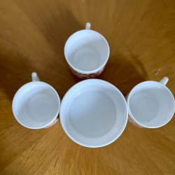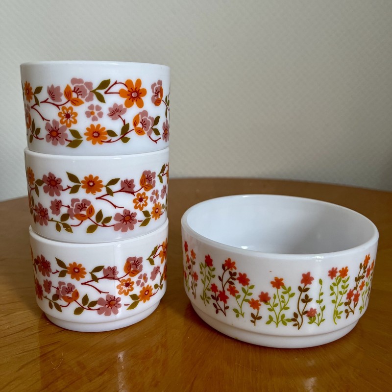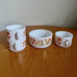 Ensemble de trois tasses et un bol coupelle, Arcopal modèle Scania vintage 1970. En très bon état de conservation. Très kitsch et ultra tendance pour des petits déjeuners ou pauses café et goûters. Un grand classique indémodable et typique de cette époque des années 70.